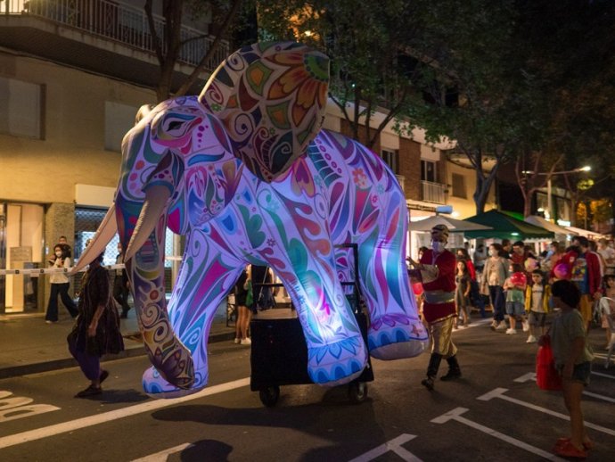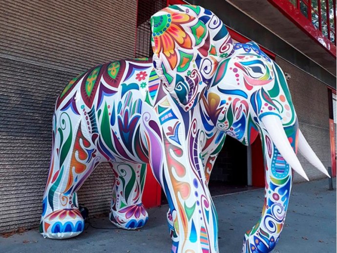 Elefantes hinchables muy peculiares con una pintoresca pigmentación de piel de mil colores que por la noche se iluminan.